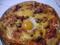 カリカリベーコンを散らし、真ん中に生卵を割り落とし、ピザ用チーズを卵にかからないように振りかけます。