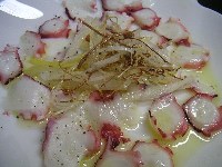 油で揚げたネギと生の白髪ネギをお皿に並べた鮹の上にもります。